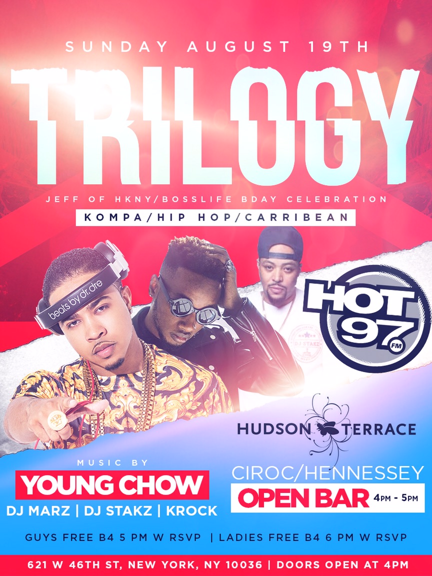 Sunday August 19th Everyone Free entry + Free Hennessy and Ciroc ![]() Ladies free before 6pm and Guys free before 5pm with rsvp Complimentary Ciroc and Hennessy for all from 4pm-5pm at Hudson Terrace ![]() Music By: DJ Young Chow DJ Stakz DJ Marz and DJ Krock It's Your Birthday VIP bottle package: $550 For more info | tables | birthdays cal or text ![]() |
